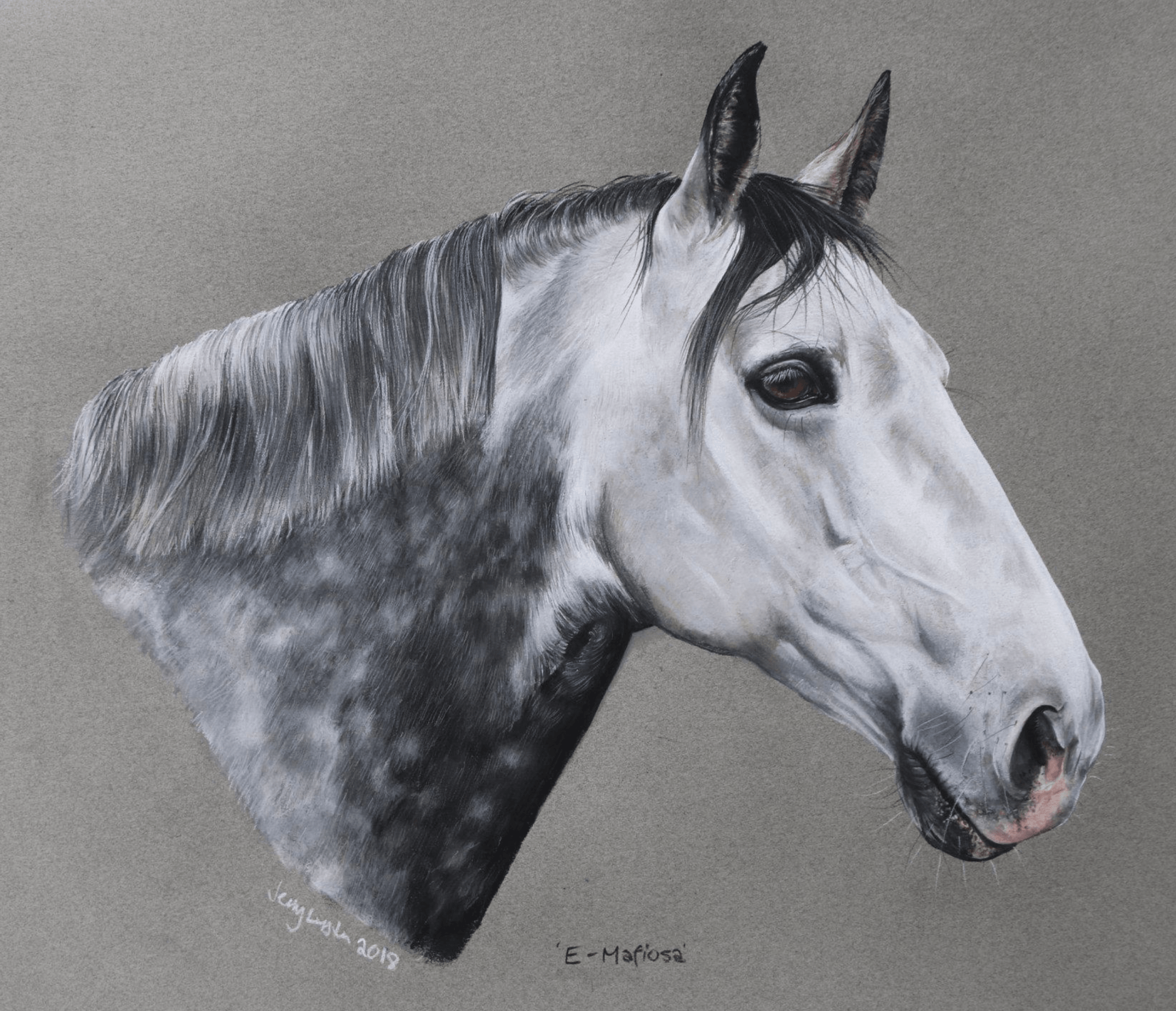 I did this piece back in 2021, and as it was a really emotional piece to do, I haven’t shared it until now. Cameron and Mary’s son George tragically died in a road accident in his first fortnight at University back in 2018. Two years on, Cameron commissioned me to do a portrait of George on the horse he shared with Mary, as a surprise for her. We were all systems go when Cameron realised the pic I thought would be best to work from wasn’t the right horse! I went down to photograph him late in 2020 just as his coat was turning, and it was a bit of high speed effort to grab enough photos without being spotted by Mary, who was out riding. He was also muddy, and wondering what this mad human jumping around his field was doing! But he was a star, put his ears forward and gave me the biggest smile! Then I had to hide in the car when she came back as I was parked by the stables! Next I had to find a jumping photo, and thanks to social media and a lot of helpful eventing people, I eventually tracked down a good jumping photo to work from, taken by the wonderfully talented Dave Cameron. The photo is of George competing in the U18 Scottish Team at Frickley Park in 2016, and I’m so thankful to Dave for allowing me to work from it. I’ve done plenty of portraits when I’m trying to get the right look, the feel, for animals that have already passed. Never before for a human, someone I had known a little. Hence I put myself under immense pressure to really capture George, because it was so important to me to do this right, for the Crawfords. It’s always difficult working from photos of people. Human expressions are more mobile, varied, and often an instant in time that isn’t the feel you want. I had to make the image larger than I normally would, to make sure I got enough space to get the detail right. In the photo, George’s face had such focus and determination, so I tried to make that concentration his expression. I had to keep walking away from it, as it was pretty encompassing and overwhelming at times. Then it suddenly just came right, and I felt him look at me, in itself hugely moving and flooring simultaneously. I’m even feeling it all again as I write this. For Cairnside Ambition, I wanted to capture his generosity of spirit, his joy at his life. Doesn’t he have the smiliest expression? Thank you so much to Cameron for trusting me with such a very special commission. Pastel on Canson Paper Framed size 35 inches x 30 inches