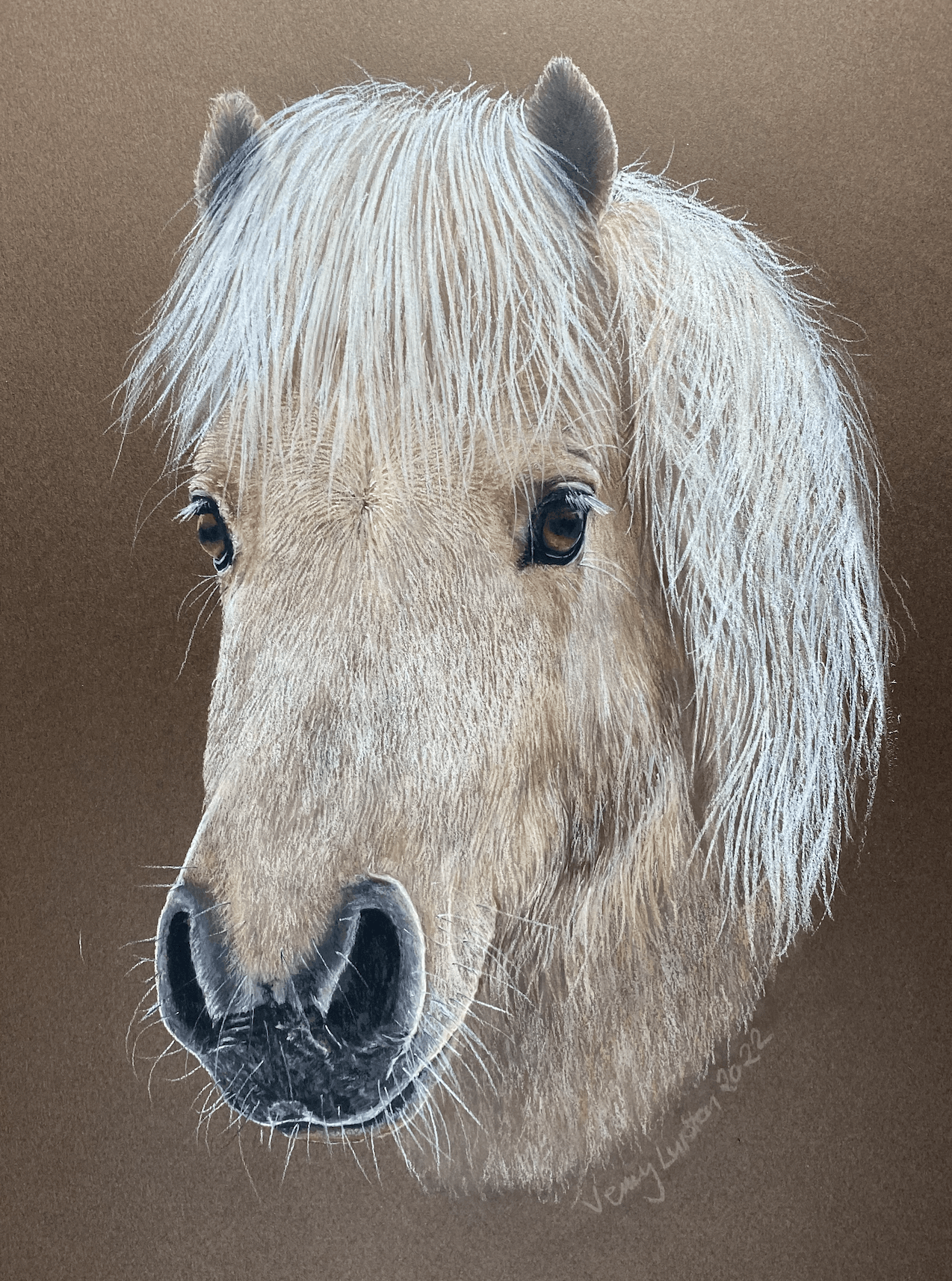 I did this piece back in 2021, and as it was a really emotional piece to do, I haven’t shared it until now. Cameron and Mary’s son George tragically died in a road accident in his first fortnight at University back in 2018. Two years on, Cameron commissioned me to do a portrait of George on the horse he shared with Mary, as a surprise for her. We were all systems go when Cameron realised the pic I thought would be best to work from wasn’t the right horse! I went down to photograph him late in 2020 just as his coat was turning, and it was a bit of high speed effort to grab enough photos without being spotted by Mary, who was out riding. He was also muddy, and wondering what this mad human jumping around his field was doing! But he was a star, put his ears forward and gave me the biggest smile! Then I had to hide in the car when she came back as I was parked by the stables! Next I had to find a jumping photo, and thanks to social media and a lot of helpful eventing people, I eventually tracked down a good jumping photo to work from, taken by the wonderfully talented Dave Cameron. The photo is of George competing in the U18 Scottish Team at Frickley Park in 2016, and I’m so thankful to Dave for allowing me to work from it. I’ve done plenty of portraits when I’m trying to get the right look, the feel, for animals that have already passed. Never before for a human, someone I had known a little. Hence I put myself under immense pressure to really capture George, because it was so important to me to do this right, for the Crawfords. It’s always difficult working from photos of people. Human expressions are more mobile, varied, and often an instant in time that isn’t the feel you want. I had to make the image larger than I normally would, to make sure I got enough space to get the detail right. In the photo, George’s face had such focus and determination, so I tried to make that concentration his expression. I had to keep walking away from it, as it was pretty encompassing and overwhelming at times. Then it suddenly just came right, and I felt him look at me, in itself hugely moving and flooring simultaneously. I’m even feeling it all again as I write this. For Cairnside Ambition, I wanted to capture his generosity of spirit, his joy at his life. Doesn’t he have the smiliest expression? Thank you so much to Cameron for trusting me with such a very special commission. Pastel on Canson Paper Framed size 35 inches x 30 inches