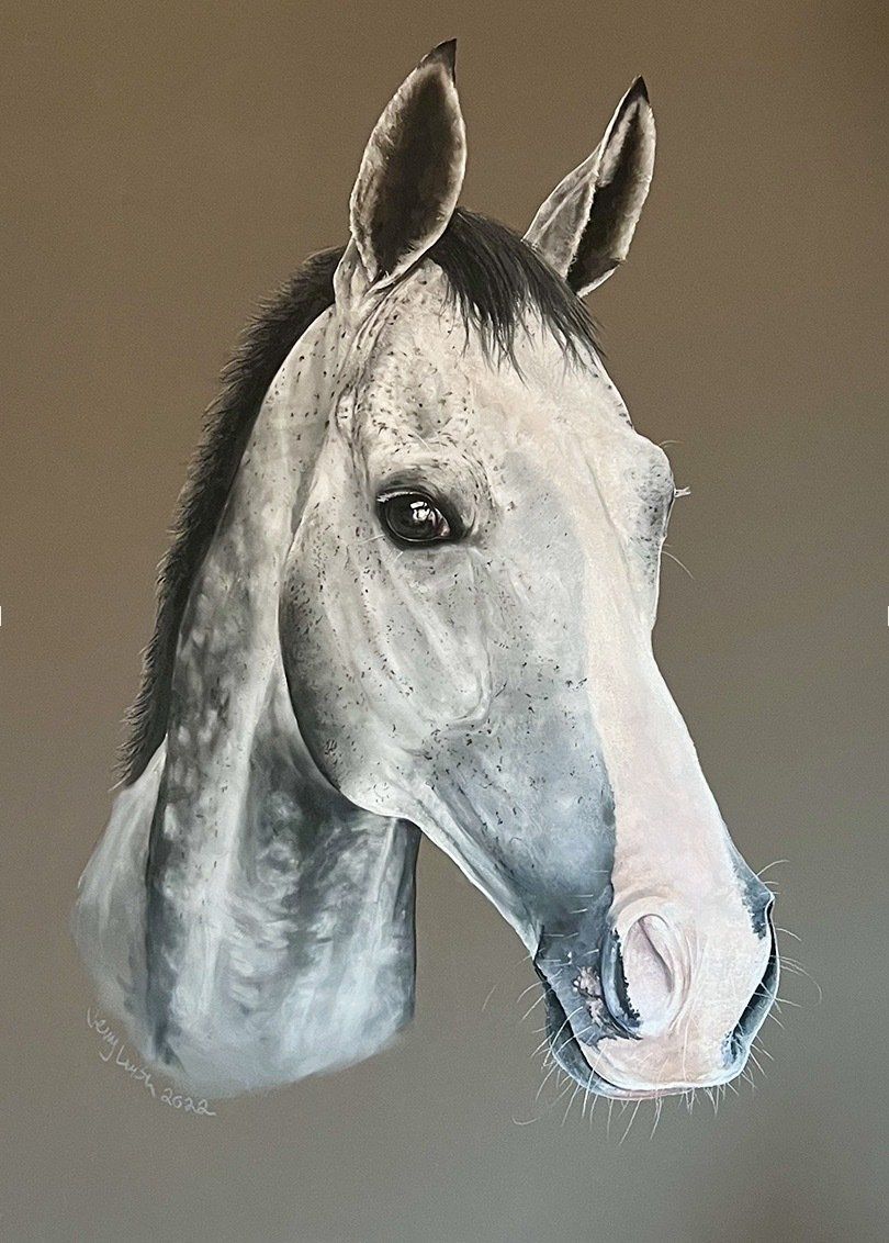 I did this piece back in 2021, and as it was a really emotional piece to do, I haven’t shared it until now. Cameron and Mary’s son George tragically died in a road accident in his first fortnight at University back in 2018. Two years on, Cameron commissioned me to do a portrait of George on the horse he shared with Mary, as a surprise for her. We were all systems go when Cameron realised the pic I thought would be best to work from wasn’t the right horse! I went down to photograph him late in 2020 just as his coat was turning, and it was a bit of high speed effort to grab enough photos without being spotted by Mary, who was out riding. He was also muddy, and wondering what this mad human jumping around his field was doing! But he was a star, put his ears forward and gave me the biggest smile! Then I had to hide in the car when she came back as I was parked by the stables! Next I had to find a jumping photo, and thanks to social media and a lot of helpful eventing people, I eventually tracked down a good jumping photo to work from, taken by the wonderfully talented Dave Cameron. The photo is of George competing in the U18 Scottish Team at Frickley Park in 2016, and I’m so thankful to Dave for allowing me to work from it. I’ve done plenty of portraits when I’m trying to get the right look, the feel, for animals that have already passed. Never before for a human, someone I had known a little. Hence I put myself under immense pressure to really capture George, because it was so important to me to do this right, for the Crawfords. It’s always difficult working from photos of people. Human expressions are more mobile, varied, and often an instant in time that isn’t the feel you want. I had to make the image larger than I normally would, to make sure I got enough space to get the detail right. In the photo, George’s face had such focus and determination, so I tried to make that concentration his expression. I had to keep walking away from it, as it was pretty encompassing and overwhelming at times. Then it suddenly just came right, and I felt him look at me, in itself hugely moving and flooring simultaneously. I’m even feeling it all again as I write this. For Cairnside Ambition, I wanted to capture his generosity of spirit, his joy at his life. Doesn’t he have the smiliest expression? Thank you so much to Cameron for trusting me with such a very special commission. Pastel on Canson Paper Framed size 35 inches x 30 inches