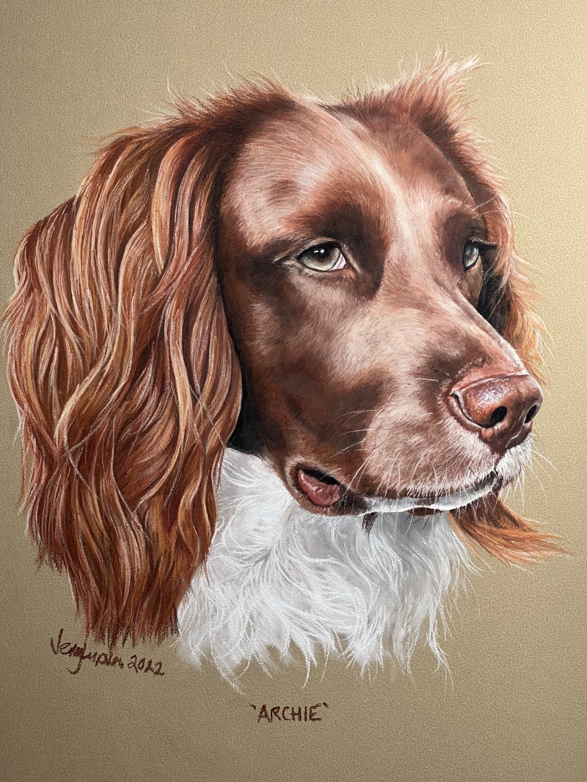 Another of the Blair exhibits, the glorious Archie. He was so chilled when I was photographing him, I could have worked from any of the photos. I love his colouring, and his light eyes, much paler than any spaniel I've previously done. He's a total dude. Archie lives with Hector (who I'll show next, as they are so different they need their own posts 😅) Their owners have this cracking photo of them both from behind, sitting looking intently through a gate. We decided it would look perfect as a vignette on the mount, and I reversed the photo for each dog, to make it individual and specific to each one. Again, the colour isn't read properly, the background isn't quite as yellow as the photograph, not as brown as the screenshot of the frame! I didn't actually get around to photographing it properly framed up, so a screenshot from the video at Blair will have to suffice.