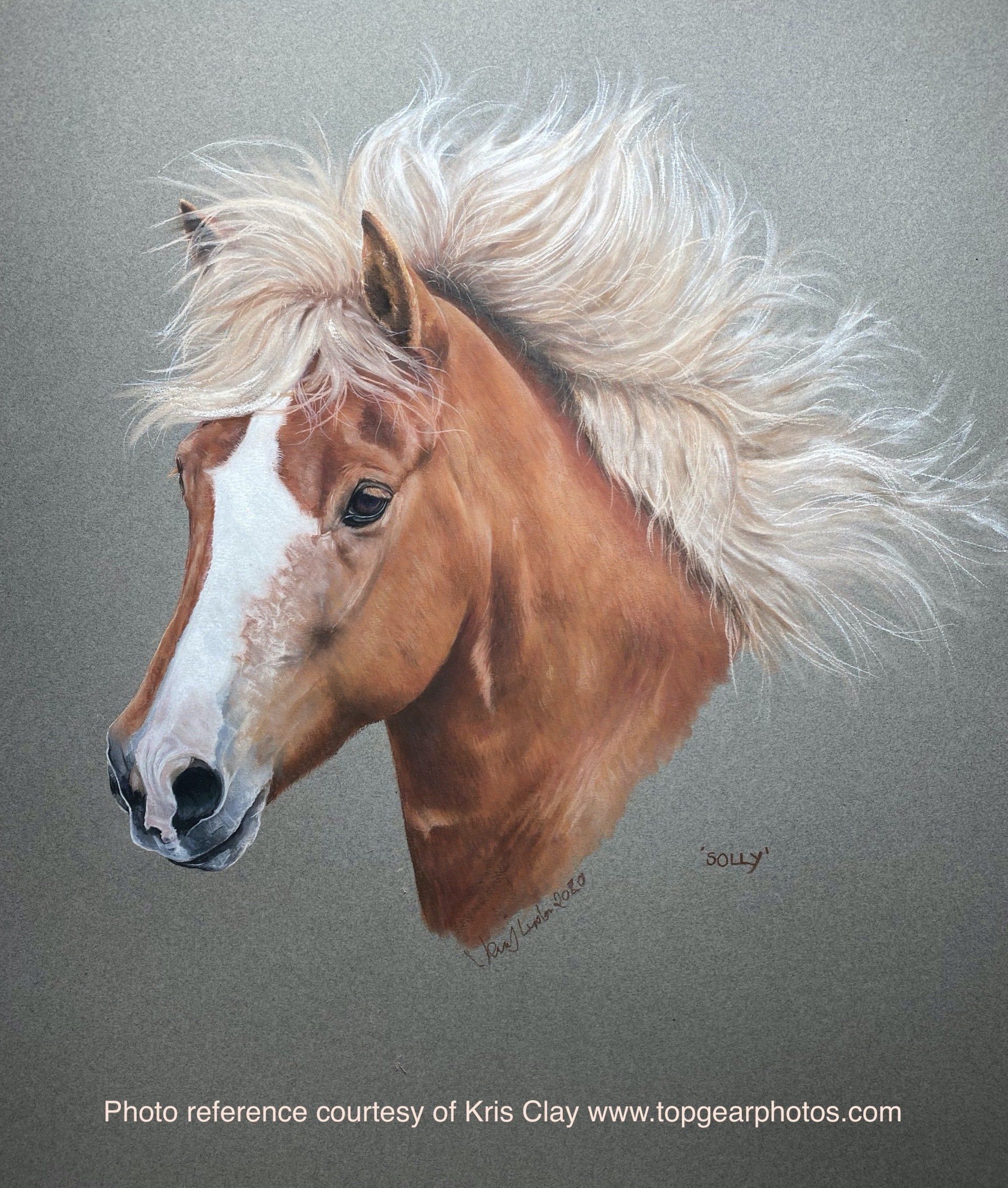I did this piece back in 2021, and as it was a really emotional piece to do, I haven’t shared it until now. Cameron and Mary’s son George tragically died in a road accident in his first fortnight at University back in 2018. Two years on, Cameron commissioned me to do a portrait of George on the horse he shared with Mary, as a surprise for her. We were all systems go when Cameron realised the pic I thought would be best to work from wasn’t the right horse! I went down to photograph him late in 2020 just as his coat was turning, and it was a bit of high speed effort to grab enough photos without being spotted by Mary, who was out riding. He was also muddy, and wondering what this mad human jumping around his field was doing! But he was a star, put his ears forward and gave me the biggest smile! Then I had to hide in the car when she came back as I was parked by the stables! Next I had to find a jumping photo, and thanks to social media and a lot of helpful eventing people, I eventually tracked down a good jumping photo to work from, taken by the wonderfully talented Dave Cameron. The photo is of George competing in the U18 Scottish Team at Frickley Park in 2016, and I’m so thankful to Dave for allowing me to work from it. I’ve done plenty of portraits when I’m trying to get the right look, the feel, for animals that have already passed. Never before for a human, someone I had known a little. Hence I put myself under immense pressure to really capture George, because it was so important to me to do this right, for the Crawfords. It’s always difficult working from photos of people. Human expressions are more mobile, varied, and often an instant in time that isn’t the feel you want. I had to make the image larger than I normally would, to make sure I got enough space to get the detail right. In the photo, George’s face had such focus and determination, so I tried to make that concentration his expression. I had to keep walking away from it, as it was pretty encompassing and overwhelming at times. Then it suddenly just came right, and I felt him look at me, in itself hugely moving and flooring simultaneously. I’m even feeling it all again as I write this. For Cairnside Ambition, I wanted to capture his generosity of spirit, his joy at his life. Doesn’t he have the smiliest expression? Thank you so much to Cameron for trusting me with such a very special commission. Pastel on Canson Paper Framed size 35 inches x 30 inches