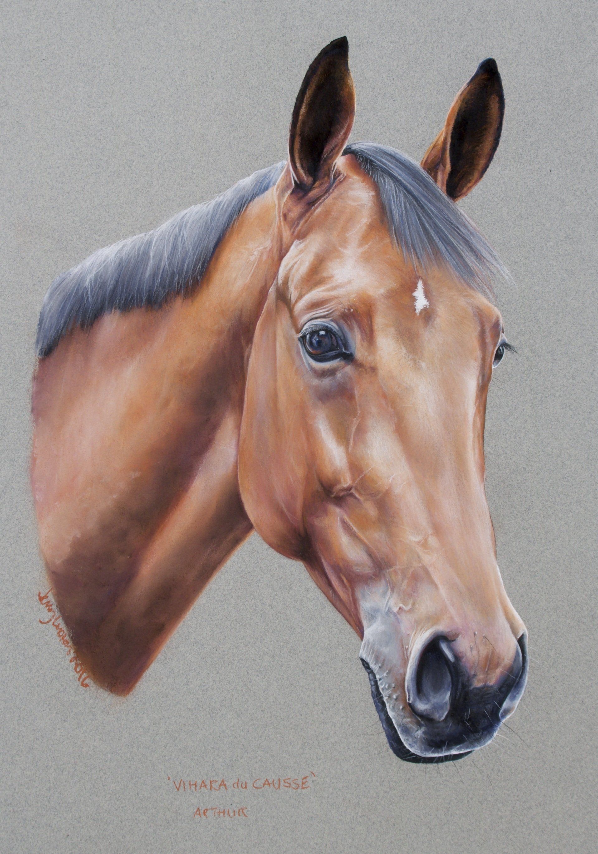 The fabulous Flash, owned by Cameron and Mary Crawford, ridden by the brilliant event rider Caroline Powell. I fist saw Flash in 2010 when I went up to Le Lion D'Angers young event horse world championships to catch up with Caroline. He was 12th in his class, he had the most incredible jump, and I'm pretty sure he could been a world class show jumper too. He blew me away. I have some phenomenal photos of him jumping. I followed him throughout his career, he's one of my most favourite horses that wasn't mine, ever. His results speak for themselves, his talent was immense, his only limitation was his fragility, and that was brilliantly managed by Caroline and her team. I have so many good memories of him. This portrait has been four years in the making. Cameron Crawford first approached me at Blair in 2018, and through assorted difficulties it has taken until now to be completed. The head shot was from ace photographer Nico Morgan, from a trot up at Burghley. The jumping photo I used was from another ace photographer, Libby Law, taken at the corner at Blenheim. To me it totally sums up his joy and exuberance over a fence. I had to wait until she was back in NZ to dig the high resolution copy out, and that happened earlier this year, so finally it was all systems go! I can't thank Nico and Libby enough for allowing me to use their photographs, and it meant I could do this piece exactly the way I wanted to. I would be lying if I didn't say I had a sinking moment when I realised it was a sparkly browband, and the ear covers were a little challenging too! I'm also not very good at making Caroline look like Caroline, as a previous portrait I did of her bears testament! I think this one's a bit more like her, especially as I had to alter the expression somewhat! However, I was more than delighted that my other creation, the fern bumplate , was nice and clear, so HAD to go in! I feel hugely privileged to have been commissioned to do Flash, so many thanks to Cameron for the commission. Pastel on Mi teinte touch paper. 20 x 23 inches.